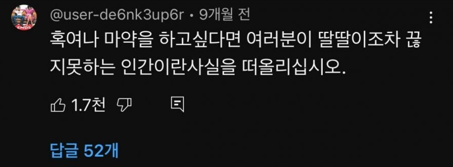 머 로다주처럼 잘 끊는 사람도 있을테니, 실패할거라면서 초치는 것도 별로같음 단정짓고 낙인찍는 것도 그 사람들이 다시 중독에 빠지는 원인이 되기도 하고