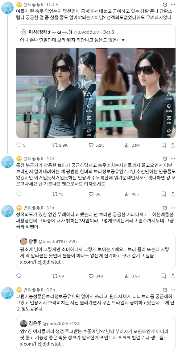 마지막짤이 정확했네 ㅋㅋㅋㅋㅋ 본문처럼 브라를 나시 정도로 여기는 사람도 있고 얘처럼 팬티랑 같은 수준으로 여기는 사람도 있고 | 25.10.11 11:24 | | |