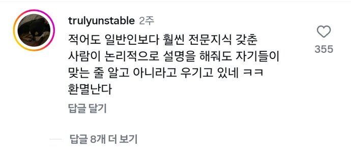 ㅋㅋㅋ 니발언 무식한거 알지? 아 물론 유튜브나 이런거 사짜들 위험하지 근데 교수들이나 그일 전문가들이 너처럼 뇌피셜로 그자리 올라감?ㅋㅋㅋ | 25.10.15 13:39 | | |