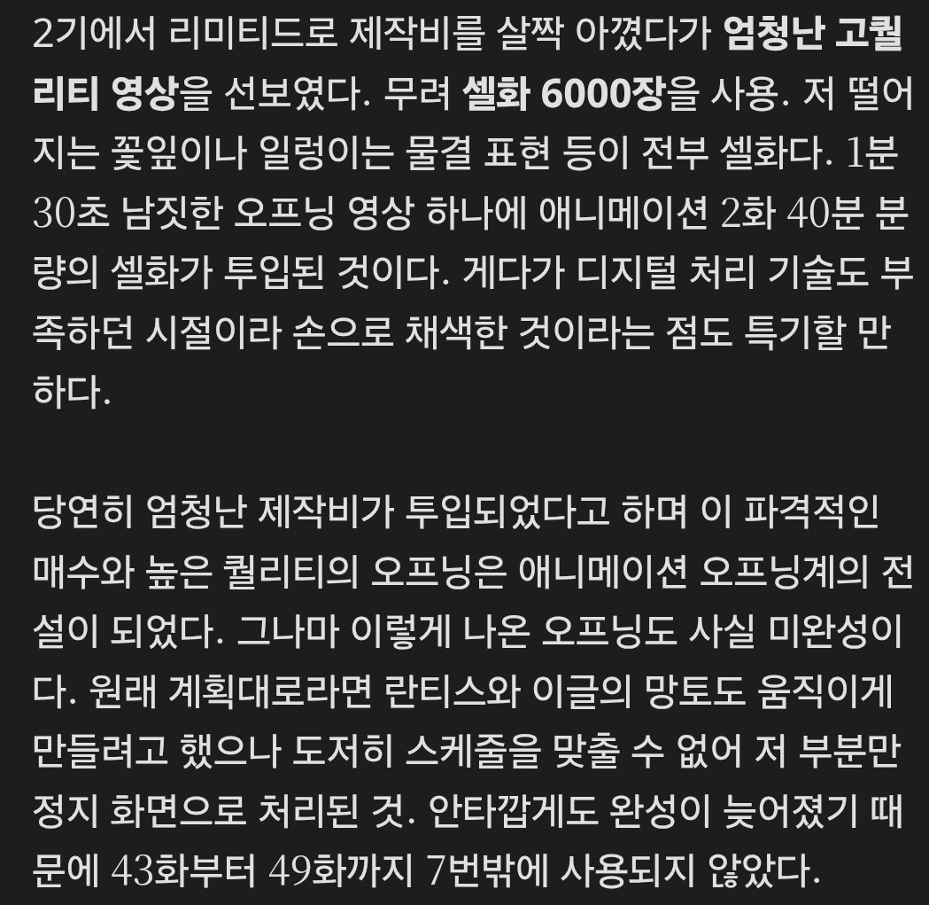 세번째 오프닝 제외하더라도 첫번째 오프닝도 어지간히 좋은편이 아니다보니... 심지어 이쪽은 곡만봐도 넘사벽 이건 솔직히 구작이 너무할정도로 돈넣었어 | 25.10.17 16:42 | | |