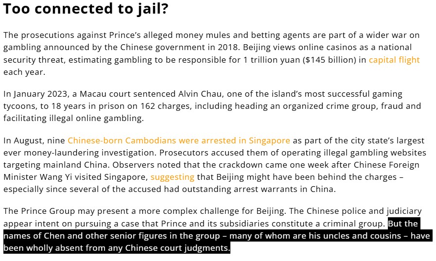 중국 경찰과 사법부는 프린스와 그 자회사들이 범죄 집단을 구성한다는 주장을 기소할 의향이 있는 것으로 보입니다. 그러나 천즈쥔과 그의 삼촌과 사촌 등 그룹의 다른 고위 인사들의 이름은 중국 법원 판결에서 전혀 언급되지 않았습니다. RAF 기사인데, 중국은 프린스 그룹 자체가 범죄집단으로 활동한다는 혐의로 기소한 거지. 개개인를 기소한 게 아님. | 25.10.18 16:26 | | |