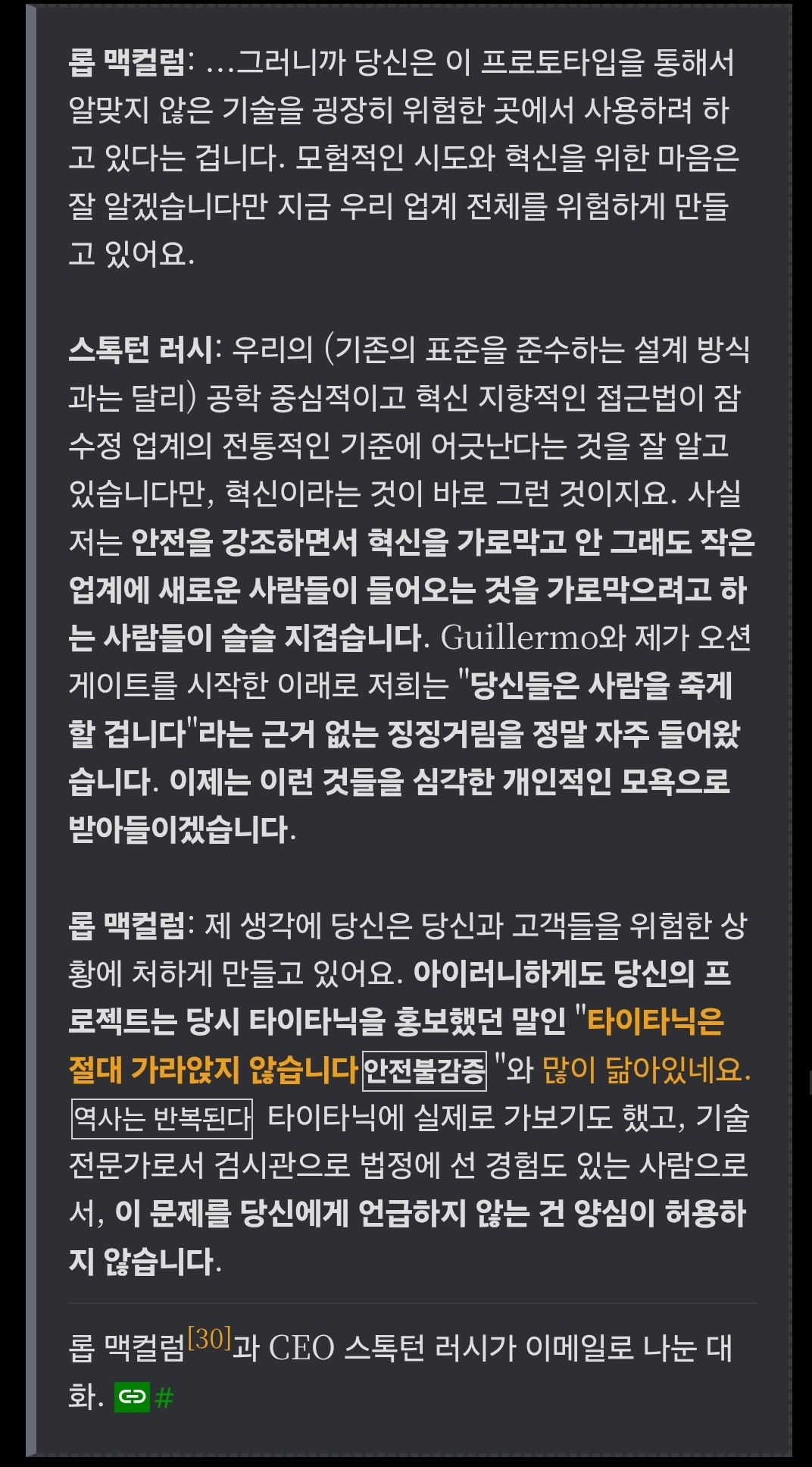 사고난 잠수정 회사 CEO: 그놈의 안전 안전. 안전 규제가 혁신을 가로막는 건 이제 지긋지긋합니다! 경쟁사 CEO: 그 말 타이타닉 침몰하기 전 관계자들이 하던 말이랑 비슷한데요