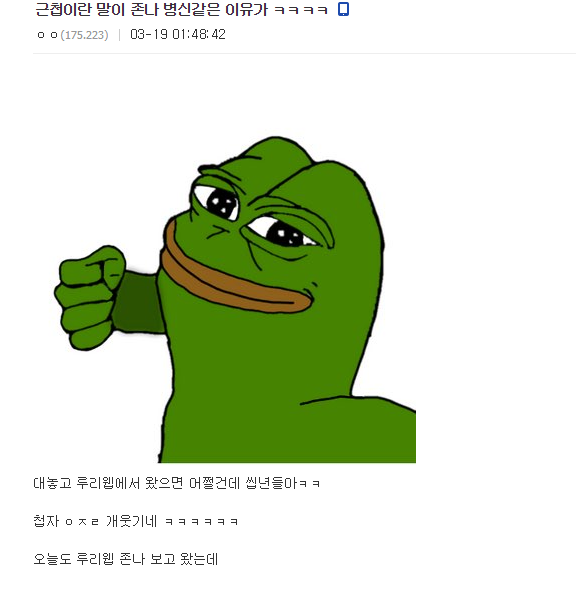 냉정히 말해서 지금 단순히 어두에 '근' 붙이는거는 사이트 색은 거의 빠졌다고 봐도 될 정도더라. 이게 어디서 온지도 모르는 사람도 많았고