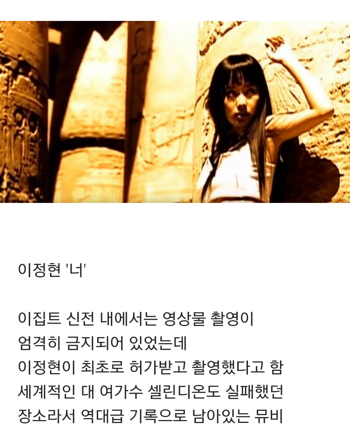 허가 떨어지면 즉시 촬영 시작하려고 이정현이 의상 풀세팅하고 대기하고 있었는데, 현장에 있던 이집트측 관계자가 그런 이정현을 보고는 "동양에서 온 소녀에게서 클레오파트라가 보인다!"라며 30분동안 촬영 허가해줌. 정작 이정현은 클레오파트라가 아니라 라(태양신) 분장을 한 것이었다고.... | 25.10.22 22:01 | | |