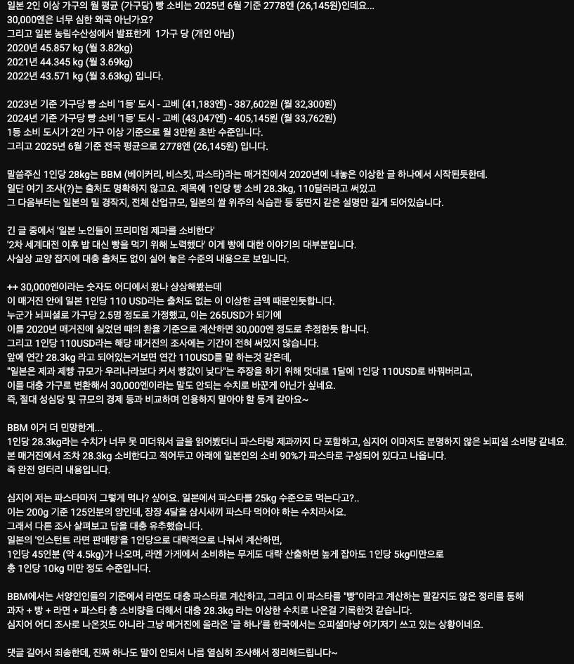 본문짤은 그냥 아예 출처가 없는 카더라 통계인데 맨날 저걸로 빵스라이팅 하는것도 웃김ㅋㅋ 빵 소비량이라는 통계는 없음. 통계 내기도 힘들고