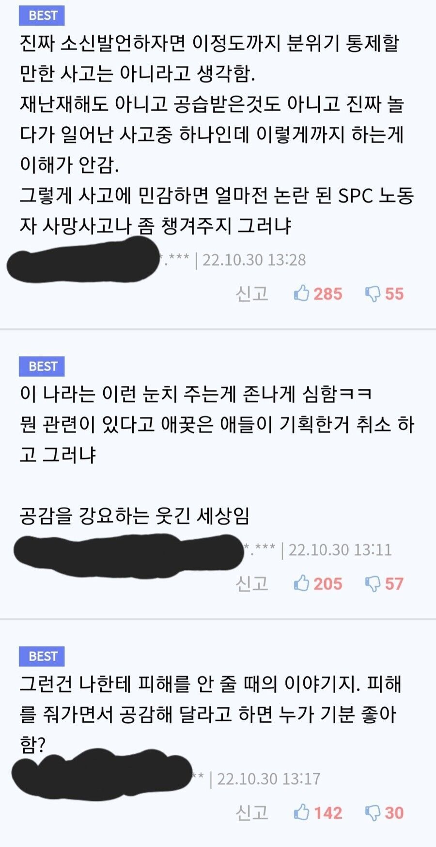 물론 사이렌까지 하는 건 과하다 생각할 순 있겠는데, 앞서서 왜 참사라 부르는지도 모르겠단 소리는 참... 놀러갔다가 사고를 당했든, 일하다 당했든 사람들이 죽고 다친 사고인데 당연히 참사라 불러야지... 뭐 놀러가다 죽어나가면 그냥 앙증맞은 찐빠라고 불러줘야 하나? | 25.10.29 09:56 | | |