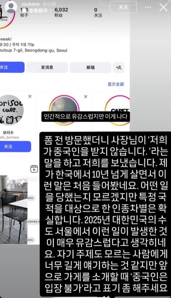 이건 그냥 이해가 안되는데? 차별발언 하는 사람을 내보내야지 중국인 금지를 박는다고? | 25.10.29 15:35 | | |