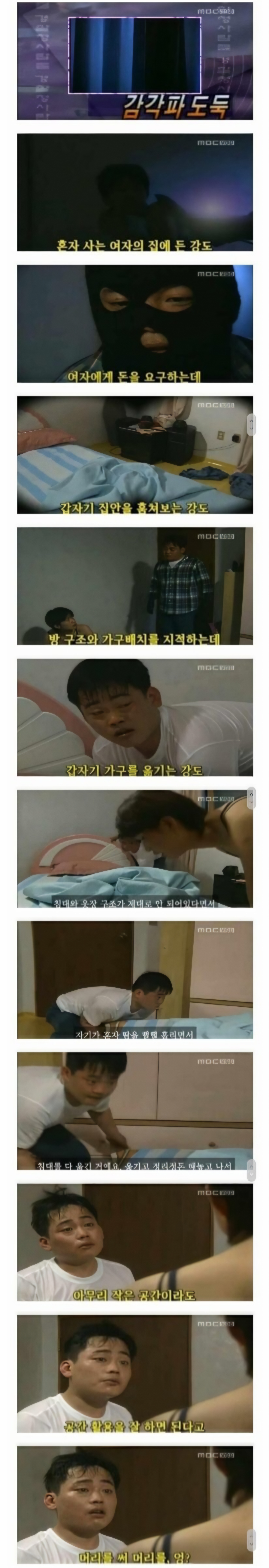손들어 ! (청소도구로 무장한) 강도다 ! 다 나가 ! 3시간 뒤에 돌아와 !
