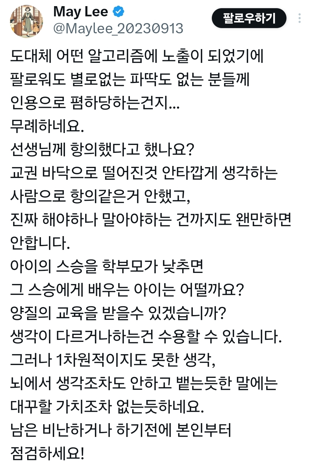 이 경우는 바르게 쓰기 연습 해와라 이런 식으로 돌려서 해도 되지 초등학교 레벨에서는 과한 표현이긴 한데 이걸 트위터에 노빠꾸로 올리는 거 역시 무례한 거 맞음 | 25.10.30 06:07 | | |