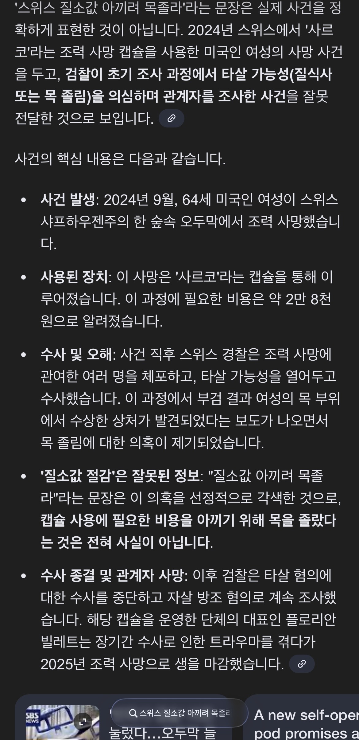 그건 그생퀴가 미친 건데? 스위스도 조력 자살의 경우 최후의 버튼은 본인이 누르게 되어 있음. 그래서 살인죄가 안되는건데, 그건 걍 살인이잖아.. 그리고 거기 어딘데 안걸렸냐? 죽고나서 의사가 시신을 확인을 하는데 목졸라 죽이면 표가 나서 바로 걸리는데 누가 그런 ㅄ짓을 함? | 25.11.02 15:33 | | |
