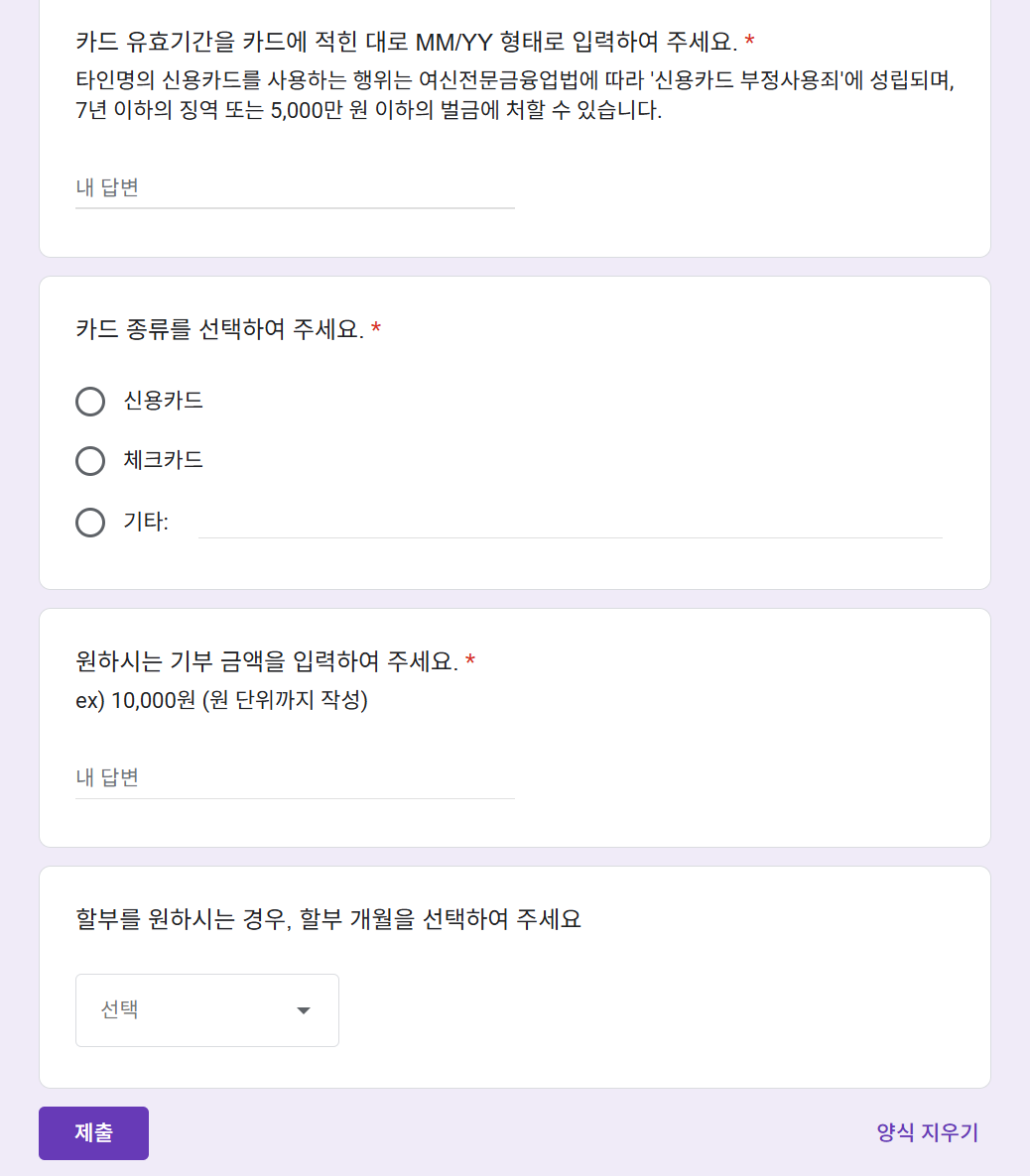 해외 거주자 및 전화를 통한 '카드 결제'가 부담스러우신 분들은 해당 폼을 통해 개인정보를 남겨주시기 바랍니다. ================================== 확인해보니까 저 구글폼 자체에서 cvc까지 요구하지는 않는 듯? 이러면 아마 자기네들이 기부액 결제하더라도 결제 전에 소유자에게 개별연락할 것으로 보임 (cvc 알아야 하니까) 근데 그렇게 수집하는 것도 문제 아닌가...? | 25.11.02 13:13 | | |