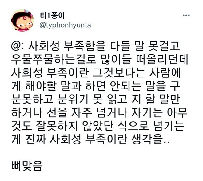 뭐 실언은 할 수 있다 쳐 실언 후에 나올 말이 "제가 좀 솔직한 편이어서요" ㅋㅋㅋㅋㅋㅋㅋㅋㅋㅋㅋㅋㅋㅋㅋㅋㅋㅋㅋㅋㅋㅋㅋㅋ 무례한 발언을 뱉어놓고 솔직함으로 포장하려 들면 안되지