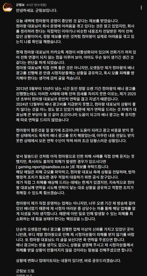 유튜버 중에 한명도 긴급 공지 올렸더만.... 거기도 망했으니 조심해라 자기 배너보고 구매한 사람 연락 달라고 하던데.