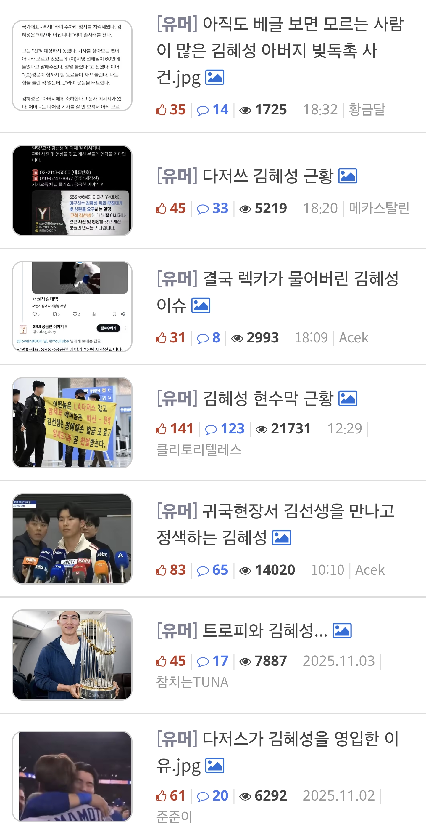 누가보면 하루종일 유게에서 김혜성이라는 사람 이야기만 한줄 알겠네 베스트에서 김혜성 검색하면 글 얼마 나오지도 않아 구글검색하라고 할게 아니고 글 작성자가 설명을 해주는게 맞지 않을까? | 25.11.07 18:38 | | |