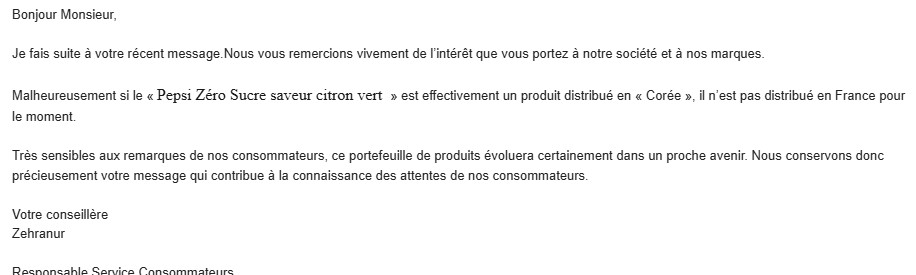 나 저거 프랑스 펩시에 프랑스에 쫌 팔면 안되냐고 하니까. 정말 한국에 판매 중이라면 당장은 프랑스에는 공급되지 않습니다. 라는 쿨펀섹화법 당함. 그러니까 생산하라니까? 니네가 LG생건이야?
