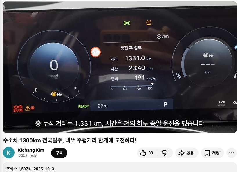 의미를 가지려면, 차도 더크고, SUV 라 주행성능도 너 나쁜데, 동일한 수소탱크를 가지고 더 멀리 갔음. 이라면, 충분히 가치 있는 기록이라고 인정해 줄 수 있음. 그런데, 수소탱크가 더 커진 이상 아무짝에도 쓸모 없는 기록이 되어 버림. 그냥 누군가 더 큰 수소탱크 달고 깨버리면 되는 기록은 그냥 '더 큰 수소탱크 장착된 수소차'와 별로 다를 바 없는 기록임. | 25.11.12 18:14 | | |