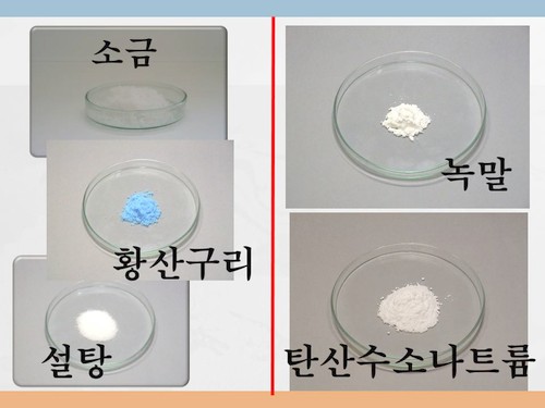 과학 시간에 이 다섯가지를 물에 넣거나 구운 뒤 관찰하는 거 했었지.. 앞의 서너가지는 직접 맛보고 맛을 종이에 적고, 황산구리는 먹지 말고 종이 칸을 비워두랬는데 어떤 애가 그 칸을 채우고 싶었던건지 저걸 먹어서 난리가 났었음.