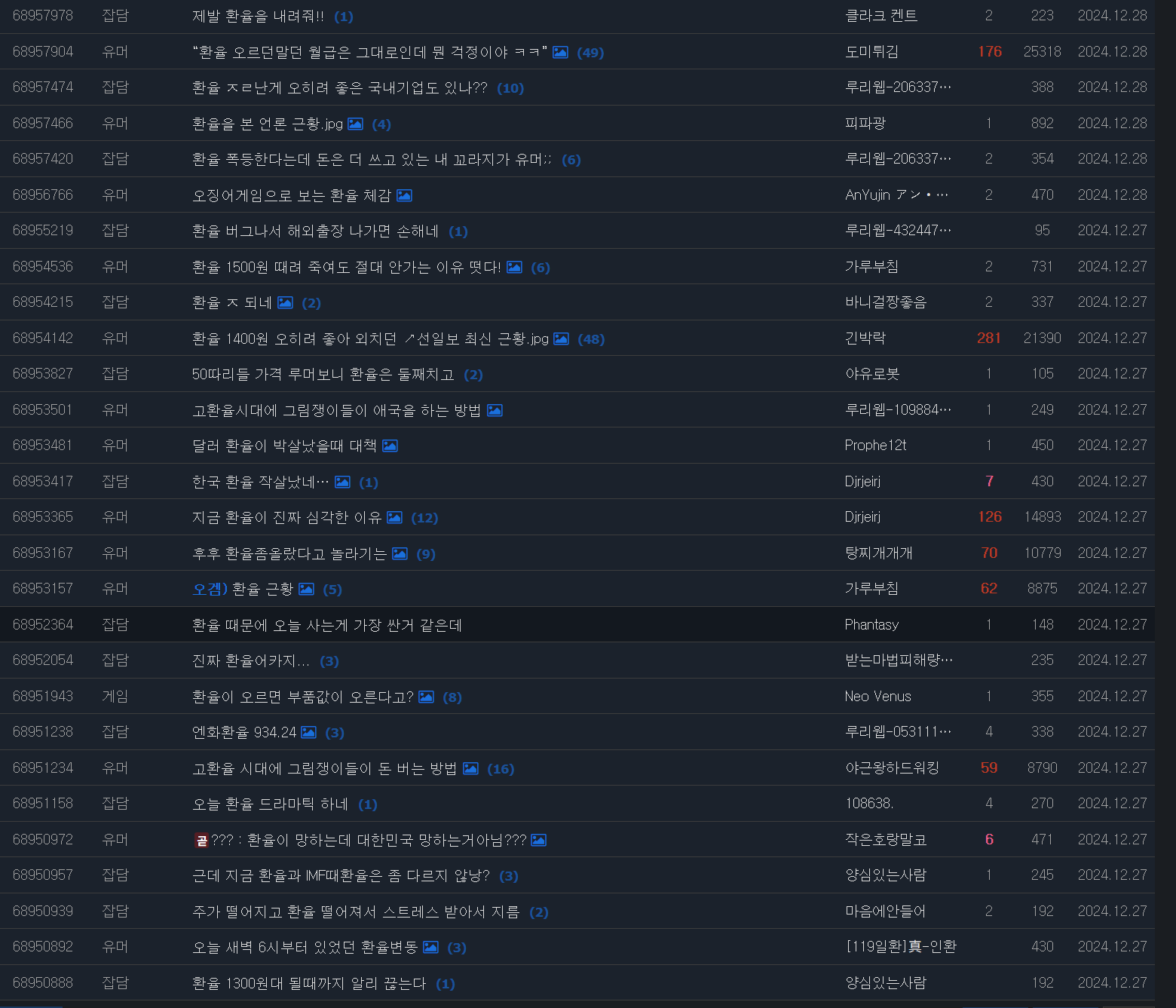 얼마 전 환율 상태 좋았을땐 좋아좋아 이러면서 글 엄청 올라가더니, 계속 환율 고공행진 하니까 이젠 입다물고 있네