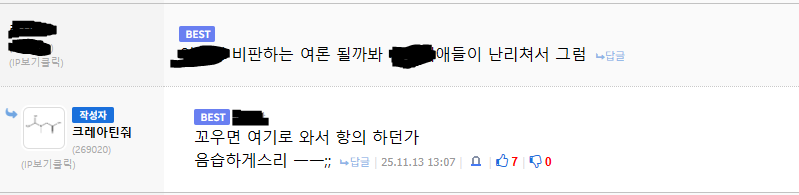 꼬우면 위로 와서 얘기해 억지로 엮지 말고 ㅋㅋㅋㅋㅋ 그리고 난 위에 쓴 글에서도 반대 세력 같은 소리 한 적도 없음 왜곡은 좀;; | 25.11.13 13:35 | | |