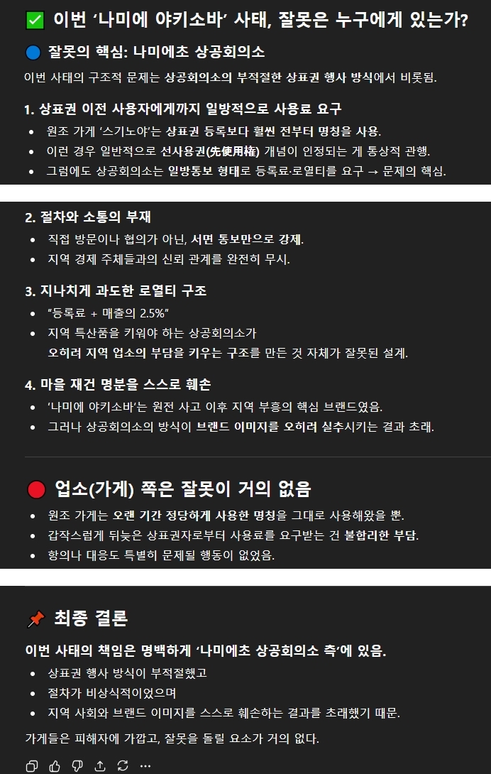 더군다나 상공회의소는 직접 찾아온 것도 아니고 서면 상으로 '우리 상표니 계속 쓰려면 등록료와 로열티를 내라'고 일방적으로 통보했다고 함.