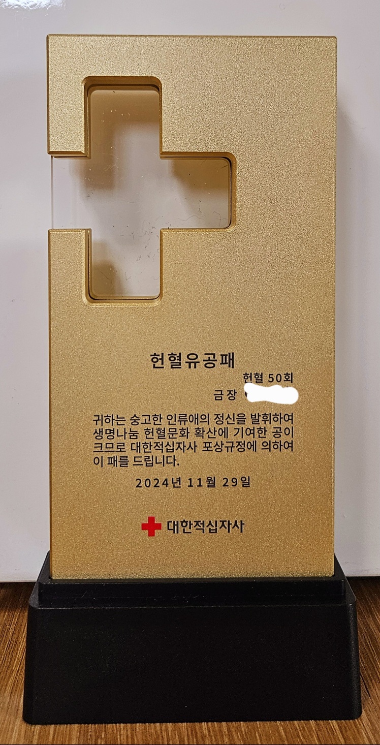전혈 100번이면 헌혈 유공자의 집 명패도 받을 수 있음. 이건 원래 전혈 아닌 경우에는 400번 해야 주는거임 | 25.11.16 12:21 | | |