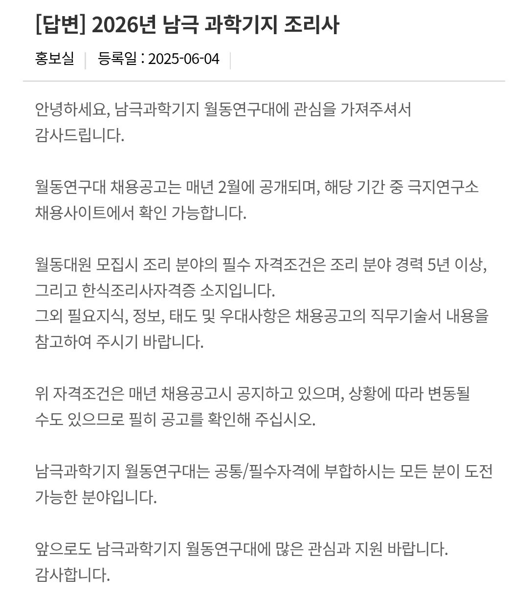 남극기지 채용조건이 이렇고 실제 공고걸면 응모하는 사람들은 국내에서 베테랑 호텔셰프 10년이상 경력자들 수두룩함 그래서 왠만한 일반인들 식사하는 것보다 상당히 고퀄임