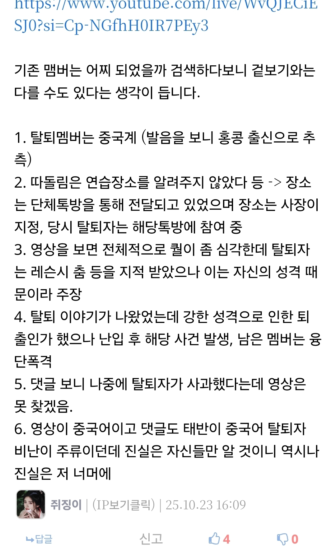 제일 예쁘고 인기가 많으니까 나머지 3명이서 짜고 왕따 시켰나보네 그렇게 왕따시킨다고 해서 자기들 인기가 많아질 일은 없을텐데 말이지 | 25.11.16 16:28 | | |