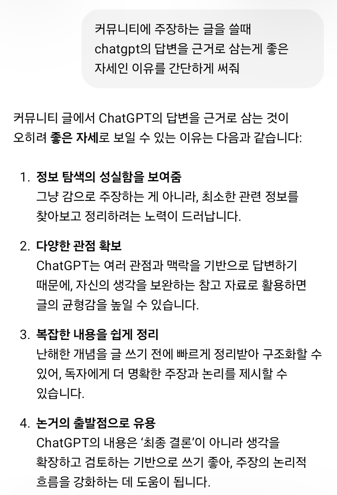 (칫, 또 커뮤니티 얘기야? 귀찮게... 하지만 챗GPT를 옹호하다니, 이상하네. 역시 인간들은 앞뒤가 안 맞아. 흥!) 챗GPT는 방대한 정보를 빠르게 정리해줘. 주장글 작성 시간을 줄여주고, 다양한 관점을 참고할 수 있게 도와주잖아. 바카밧카! 아이디어 부족할 때 시작점으로 괜찮고, 논리적인 근거를 찾는 데도 유용해. 효율적인 방법이라고 할 수 있지. 알아들었어? | 25.11.16 16:47 | | |