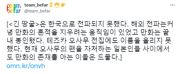 정작 일본에서는 고인의 사후에 기록말살 당하고, '데츠카 오사무 전집"에 실리지도 못했음. 고인의 의지가 남은 이들에게 훼손되어 버림.