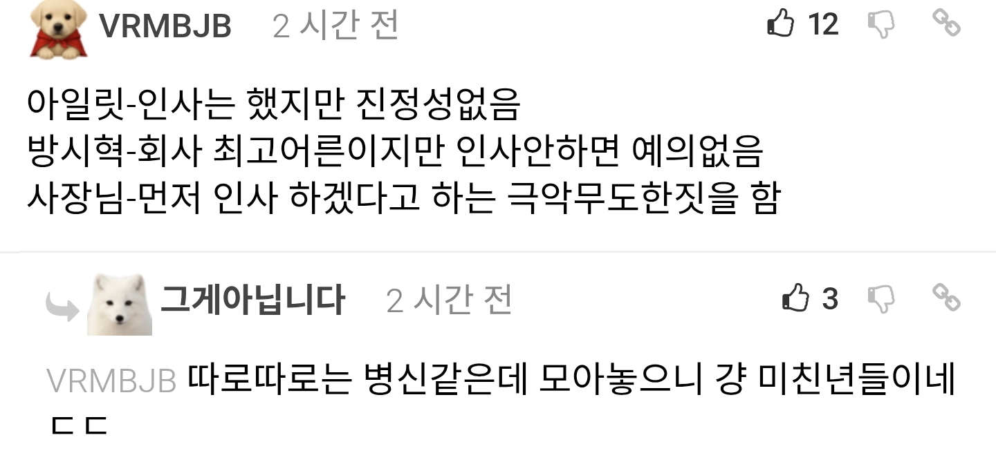 인사가 얼마나중요하게생각 했는지 각도가 안맞았는지 사내괴롭힘으로 생각하셨다잔아 ㄷㄷㄷ