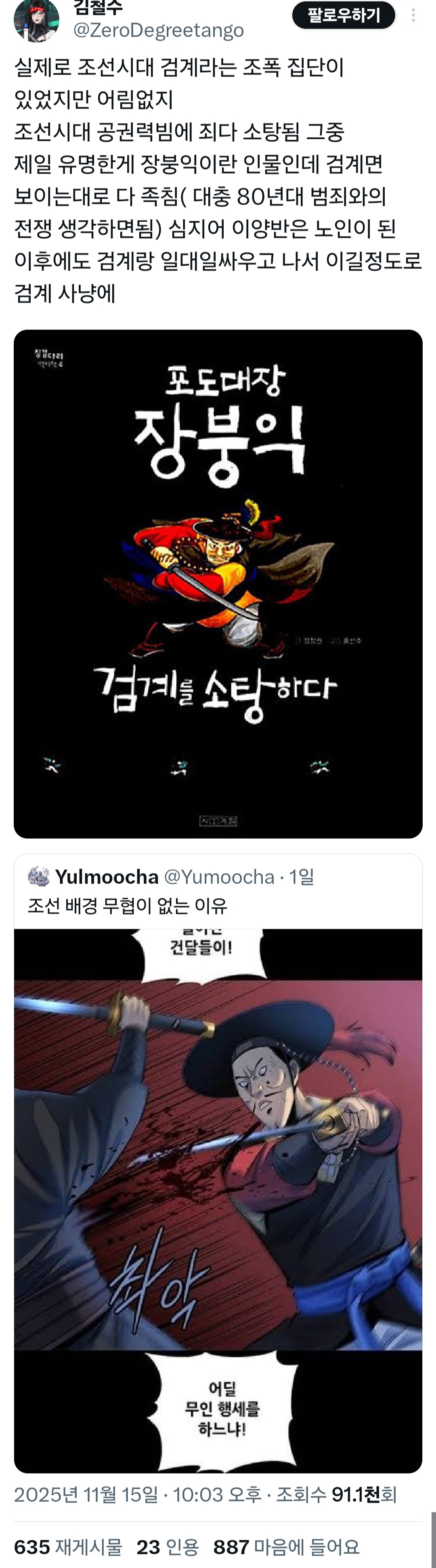 정작 검계 다 쓸어버린 장붕익도 검계 존나 위험하다고 말한게 실록에 있는데 그걸 방구석 유게이가 ㅋㅋ | 25.11.16 21:02 | | |