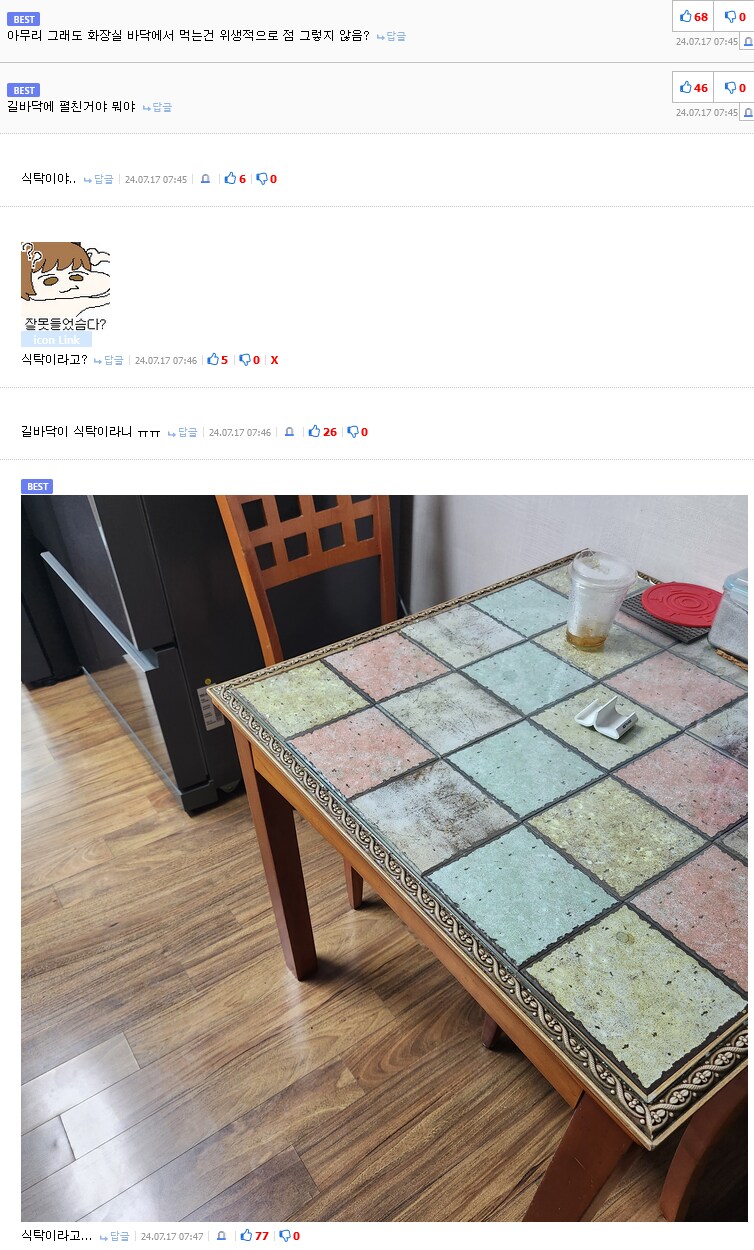 어휴 얼마나 조리돌림 당해 힘들었으면 화장실 타일을 ai 돌려서 탁자로 만들었을까 | 25.11.17 14:47 | | |