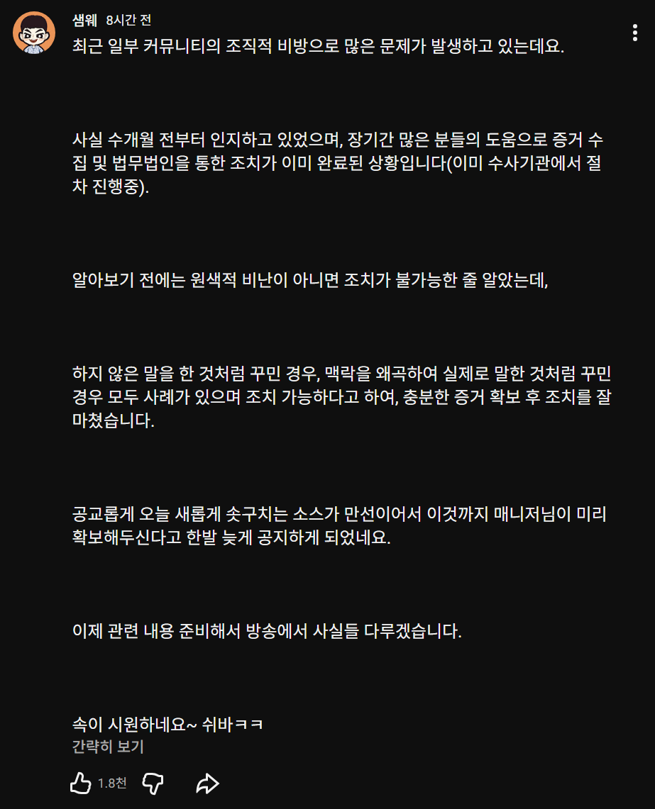 근데 행동한답시고 나선 방침이 싹다 고소해버리겠다고 으름장 놓기라... ㅎㅎ