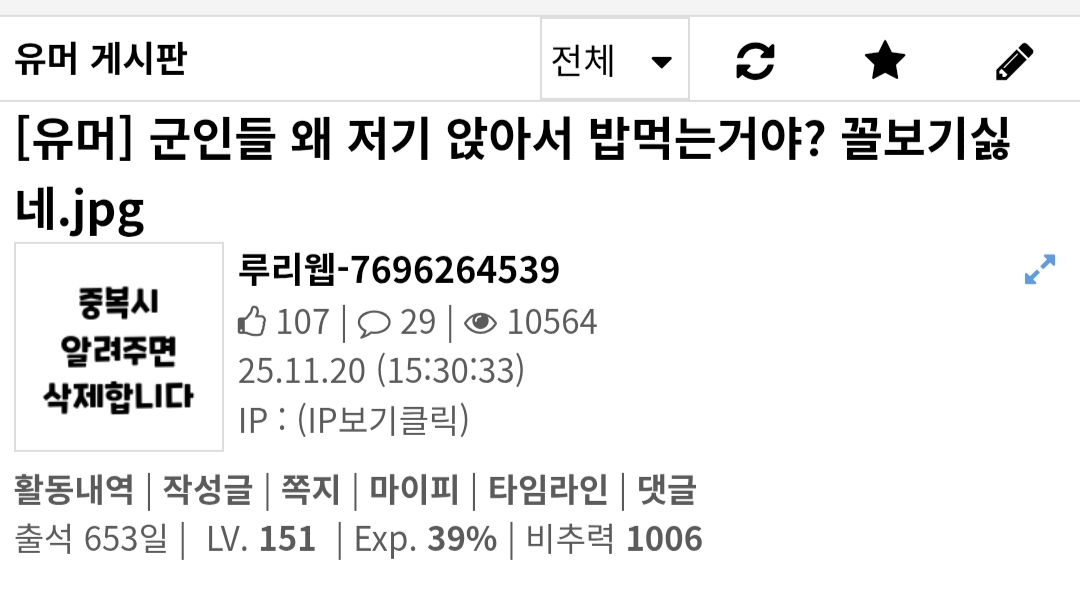 | 1876105 | 군인들 왜 저기 앉아서 밥먹는거야? 꼴보기싫네.jpg (43) | 루리웹-7696264539 | 182 | 38692 | 25.11.20 |