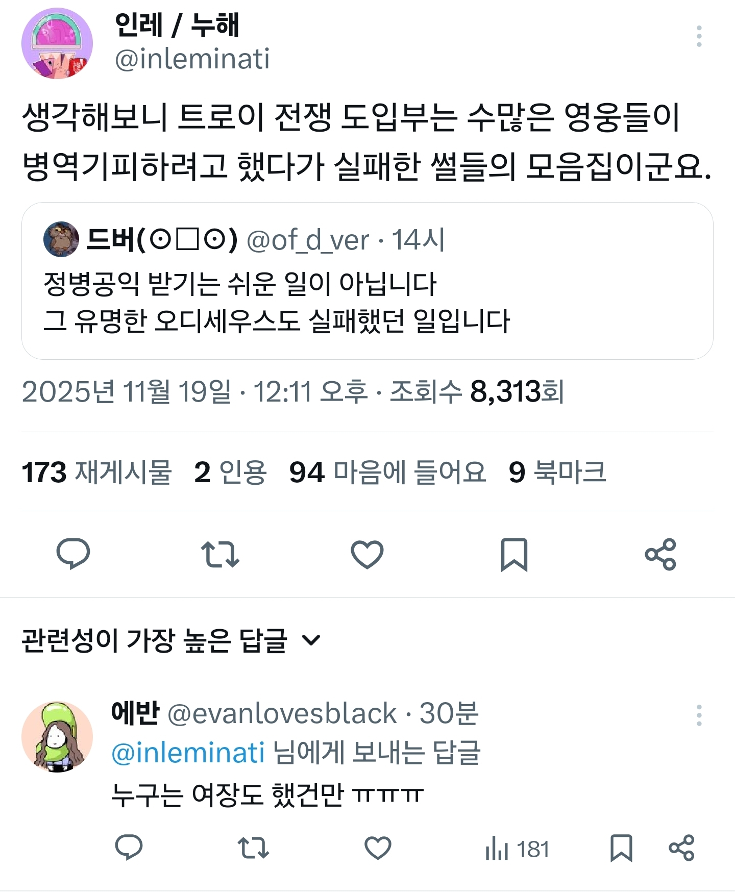 트로이 전쟁 안나가려고 오디세우스가 미친 척 연기하다 들켜서 결국 참전했죠. | 25.11.21 07:20 | | |