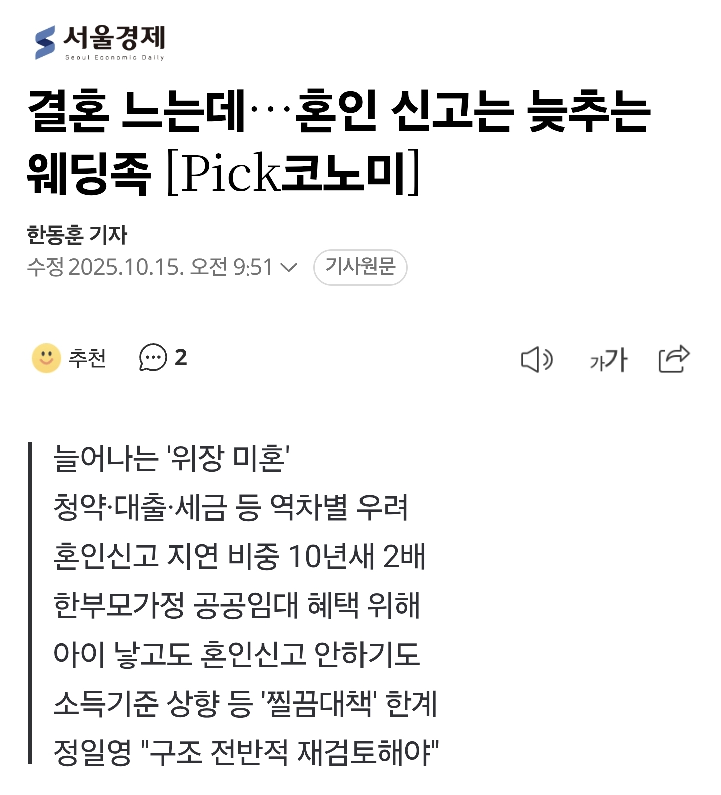 궁금한데 지금 주장하려는 게 구체적으로 뭐임? 혼인신고 미루는 비율이 그렇게 많지 않다? 아니면 조작이다? https://mmmedia.co.kr/View.aspx?No=3814675 일단 찾아보니 혼인신고 지연하는 비율이 급격히 높아지는 것 자체는 사실인 것 같은데 | 25.11.21 23:57 | | |