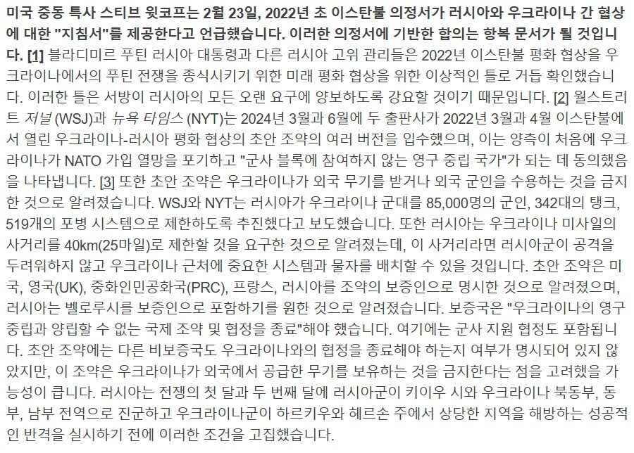 https://understandingwar.org/backgrounder/russian-offensive-campaign-assessment-february-23-2025 그때 협상안이 이 꼬라지였기에, 이거 받았어야 한다는 건 그냥 아무것도 모르고 하는 헛소리임. | 25.11.22 00:09 | | |