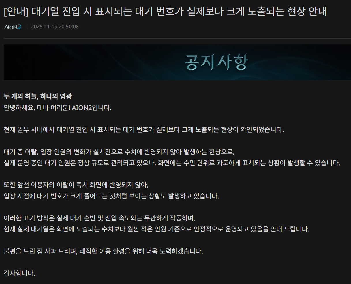 아이온1도 나오기 훨씬전, 20년전 리니지 1,2시절에도 제대로 돌아가던게 서버대기열이었는데 2025년에 그거 고칠 실력이 NC에 안 남아있다는게 더 말이 안 될거 같아... | 25.11.22 03:41 | | |