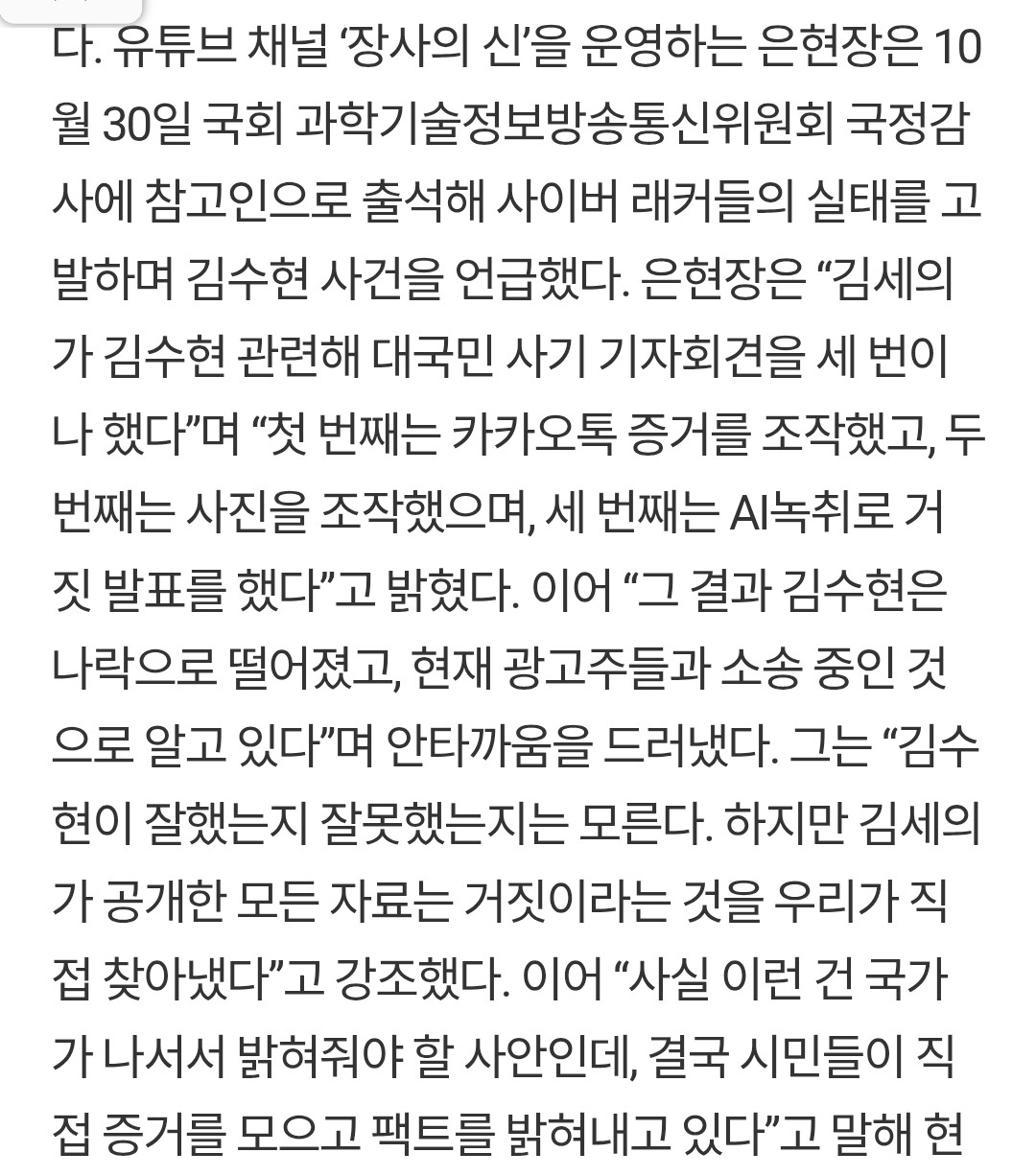 국감에서 장사의신 운영하는 양반이 말한건데 은현장이 가세연 50%매입해서 조지려고 온갖 것을 파묘하는 중이라 | 25.11.22 18:10 | | |