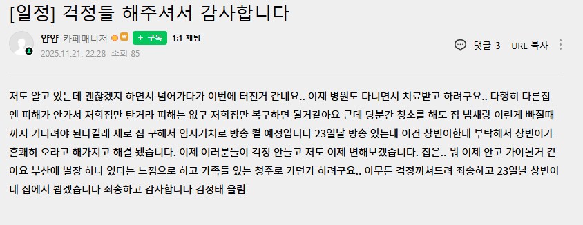 방송보는 사람들한테만 미안하고 위아래층 불난리물난리 겪은 사람들한테는 안미안한거 같네 | 25.11.22 19:54 | | |
