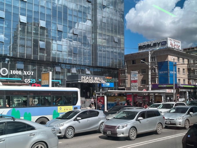 부산버스 같아 보이는 도색의 버스도 있고, 왼쪽에 gs25, 오른쪽에 cu가 있지만 몽골임.