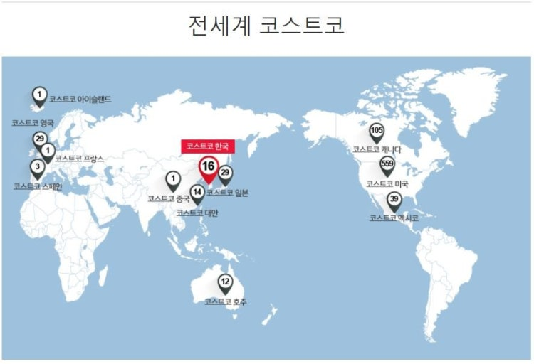코스트코가 의외로 해외 지점은 얼마 없음. (영국을 제외한 유럽쪽은 알디 같은 저가형 마트들이 많이 있어서 영역이 많이 겹침.)