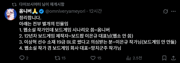 이은규라는 사람이 BL을 씀 -> 이은규 검색하니까 보드게임 제작자가 튀어나옴 -> 보드게임 & 웹소설 검색해보니까 옴니버, 망치군주 작가 두 분이 나옴 이런 흐름인건가ㅋㅋ | 25.11.26 11:42 | | |