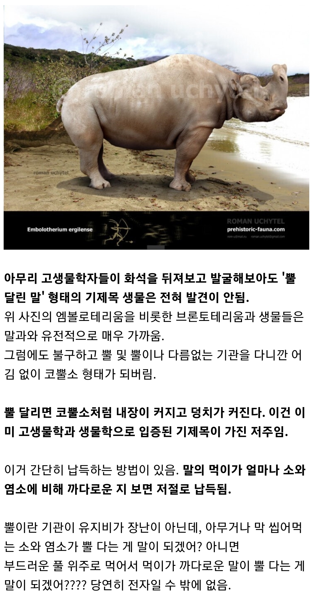 https://m.ruliweb.com/community/board/300143/read/61711002 그래서 진짜 뼈로 된 뿔(?) 달린 기제목 동물 브론토테리움(코뿔소보다 훨씬 더 먼저 등장했고 훨씬 더 말에 가까움) 우제목(소,양,염소,사슴,영양 등)처럼 되새김질 가능한 반추동물도 아닌 기제목(말,코뿔소,맥) 동물인 말이 뿔이라는 유지비 많이 드는 기관을 달기 위해서는 필연적으로 슬림한 체형을 포기하고 이렇게 코뿔소 및 브론토테리움과 같은 덩치가 될 수밖에 없음. | 25.11.26 17:03 | | |