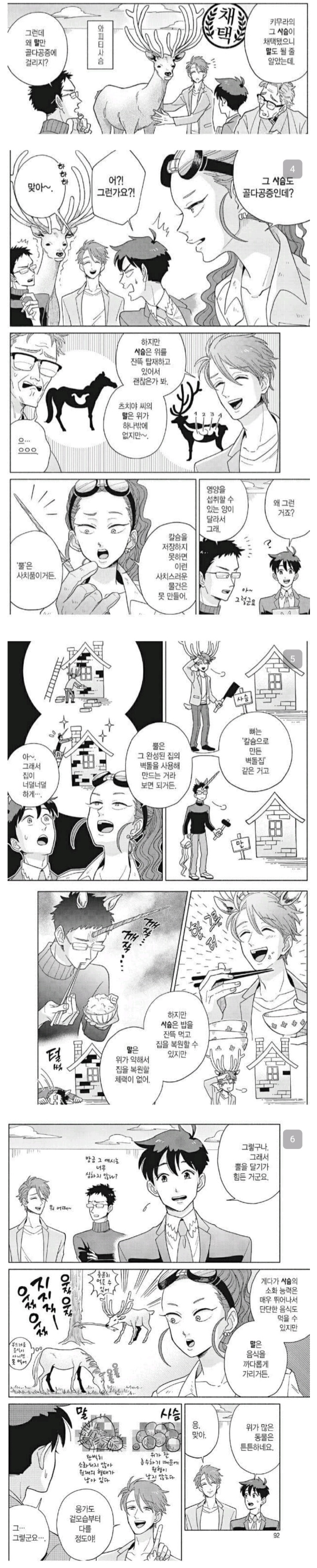 참고용 만화(제목: 천지창조 디자인부) 사슴(우제목) - 되새김질 가능 - 슬림한 몸으로도 뿔 생성 가능 말(기제목) - 되새김질 불가능 - 코뿔소 같은 헤비급 체급이 되지 않는 이상 뿔 생성 불가 | 25.11.26 17:04 | | |