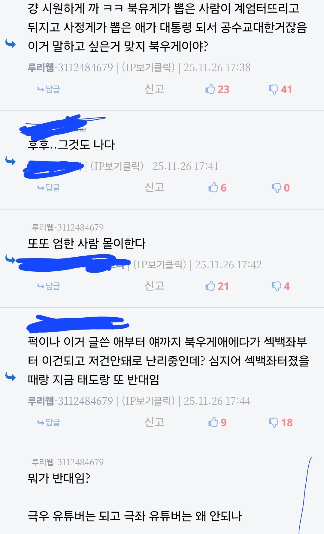 여기서 여론전 하는거임 - 얘들아, 북유게 놈들이 얼마나 나쁜 놈들인지 지금부터 내가 설명을.. (중략) - 얘들아, 사정게 놈들이 얼마나 나쁜 놈들인지 지금부터 내가 설명을.. (중략) | 25.11.26 17:20 | | |