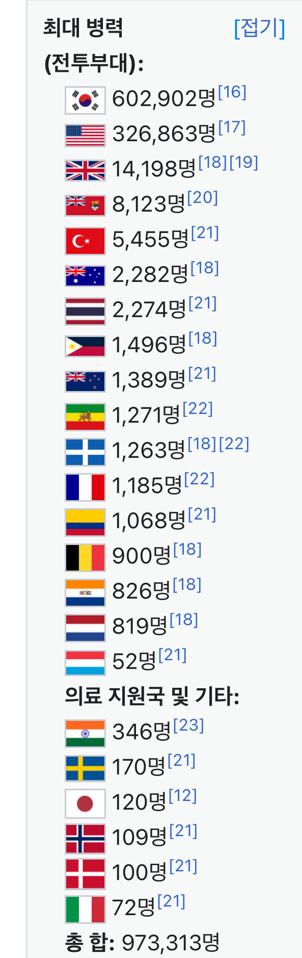 전투병력 기준 유엔군이랑 국군 다 합쳐 97만명 중공군은 전투병력 145만명 중공군이 훨씬 숫자 많았음 | 25.11.27 07:38 | | |