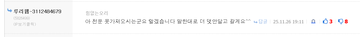 다음 날 막댓달기 스킬 공개되서 못 쓰니 떠나지를 못해서 어떻게든 막댓 사수하려고 애쓰시는 분... 추잡함은 충분히 보여준 거 같으니 당신께 막댓의 영광을 드리겠사옵니다 | 25.11.27 11:17 | | |