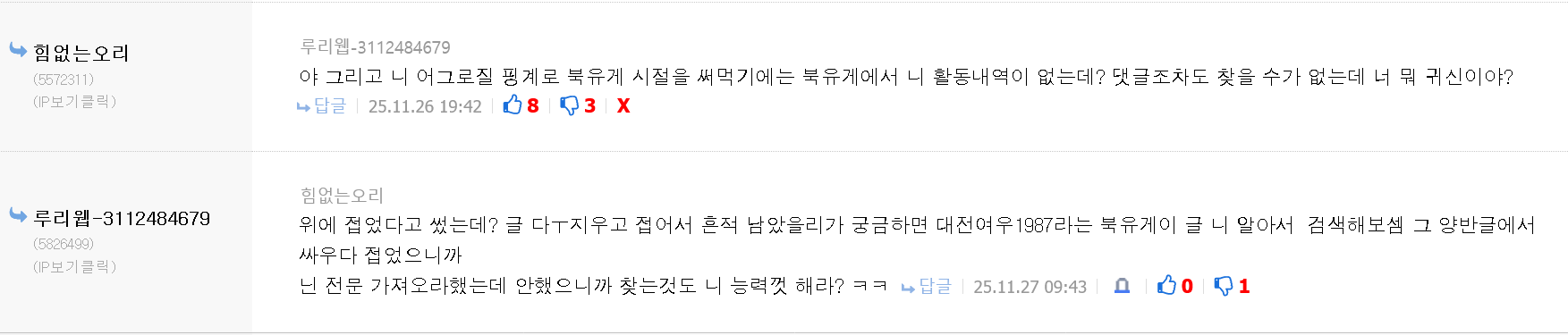 최소 1년 넘게 유게에서 북유게 타령하며 사방에서 분탕질 치신거 찔려서 튀었다가 무려 하루가 지나서 막댓 달고 정신승리 하시던 분 | 25.11.27 10:34 | | |