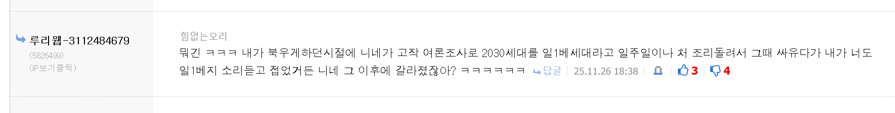 그 북유게가 고작 여론조사가지고 2030세대를 일주일동안 멍청하고 책임감없고 일상적으로 일베에 노출된 일베세대다라고 단체로 조리돌리셔서 싸우다 접었다고 말씀 드렸내요^^ 없던일 같쥬? | 25.11.27 10:53 | | |